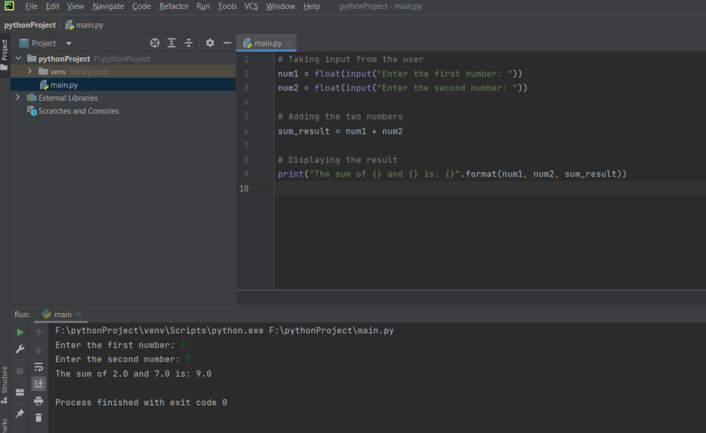 input("Enter the first number: "): This line prompts the user to enter the first number. Theinputfunction is used to read a line from the user, and the text inside the parentheses is the prompt displayed to the user.float(...): This is used to convert the user input (which is initially a string) into a floating-point number. Thefloatfunction is used for this conversion. This is important because the+operator is used for addition, and it works with numeric types.