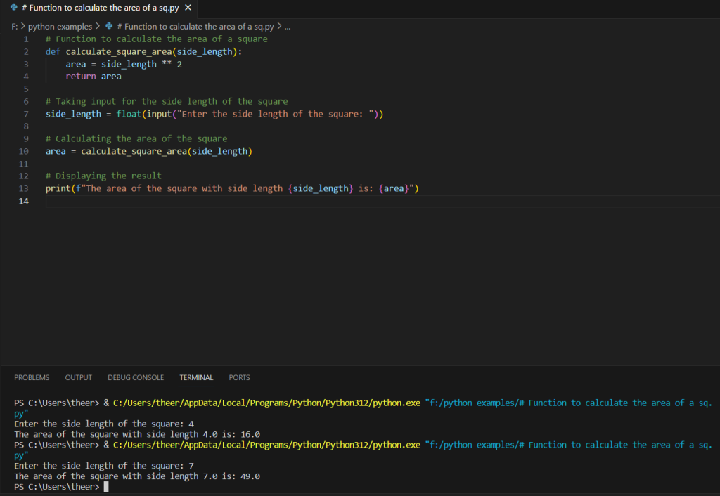 area = calculate_square_area(side_length)Thecalculate_square_areafunction is called with the user-providedside_length, and the result is stored in the variablearea. - Result Display: