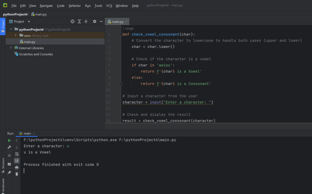 • Finally, the program prints the result to the console using the print function. The result provides information on whether the entered character is a vowel or a consonant.