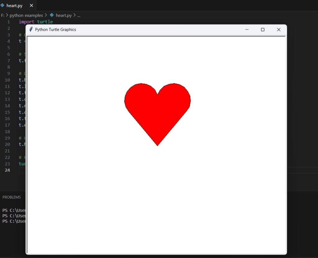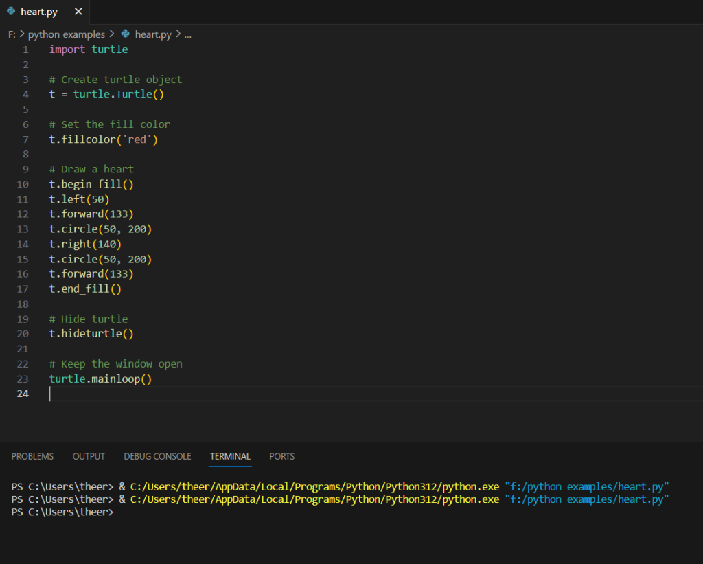 turtle.mainloop()This line ensures that the window displaying the drawn heart remains open.