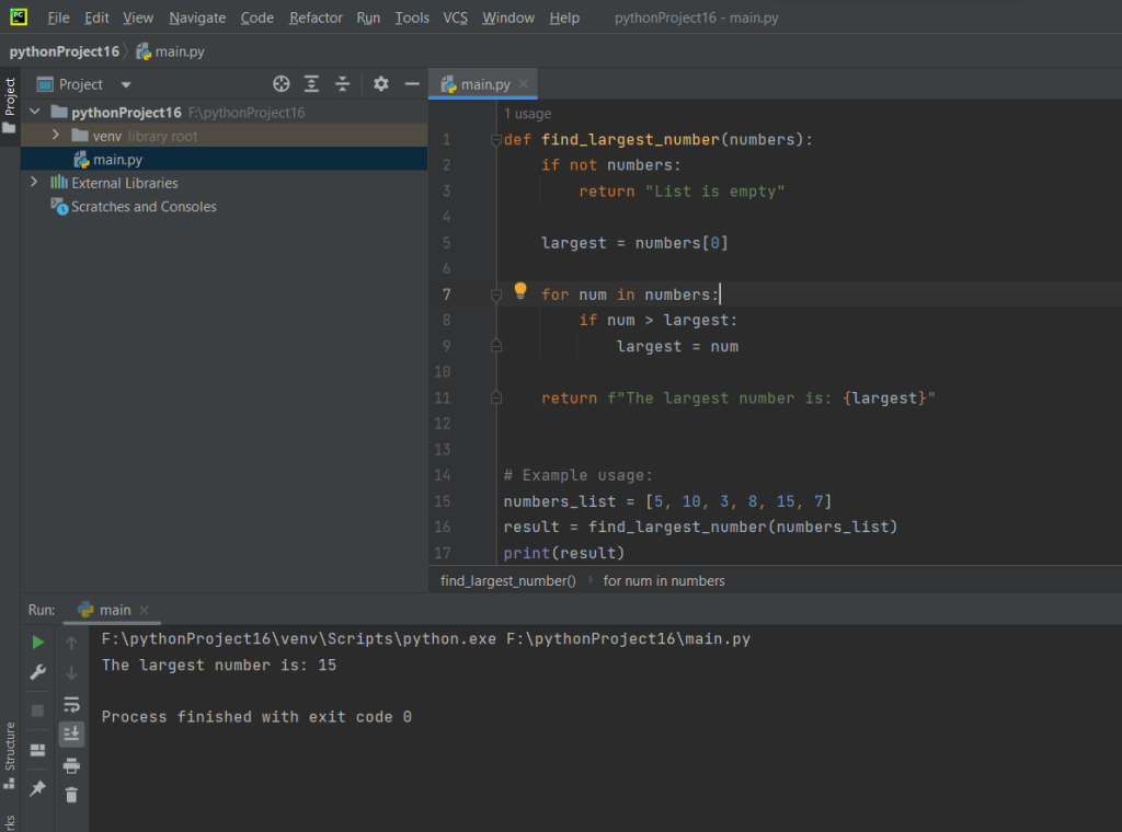 The find_largest_number function is called with the example list as an argument, and the result is stored in a variable (result).