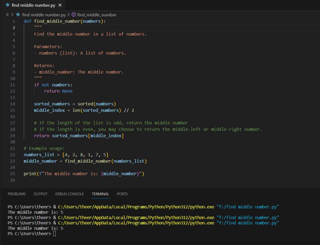 6. Example Usage:numbers_list = [4, 2, 8, 1, 7, 5] middle_number = find_middle_number(numbers_list) print(f"The middle number is: {middle_number}") This section demonstrates how to use the find_middle_number function with an example list (numbers_list). It calculates the middle number and prints the result.