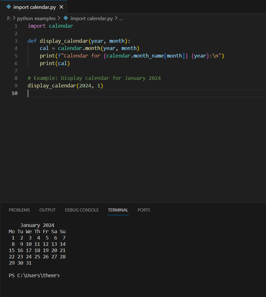 Finally, an example usage of thedisplay_calendarfunction is demonstrated by calling it with the arguments2024for the year and1for the month, which corresponds to January. This showcases the calendar for January 2024.