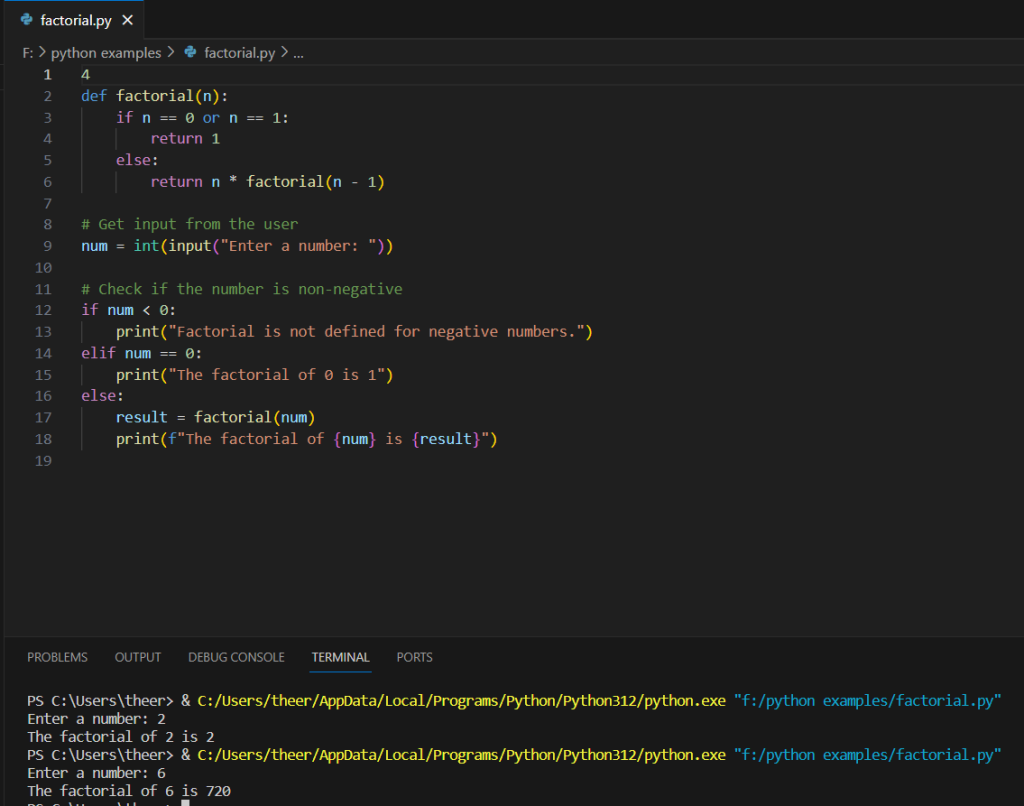 elif num == 0: print("The factorial of 0 is 1") else: result = factorial(num) print(f"The factorial of {num} is {result}")- If the entered number is non-negative and not 0, it calculates the factorial using the