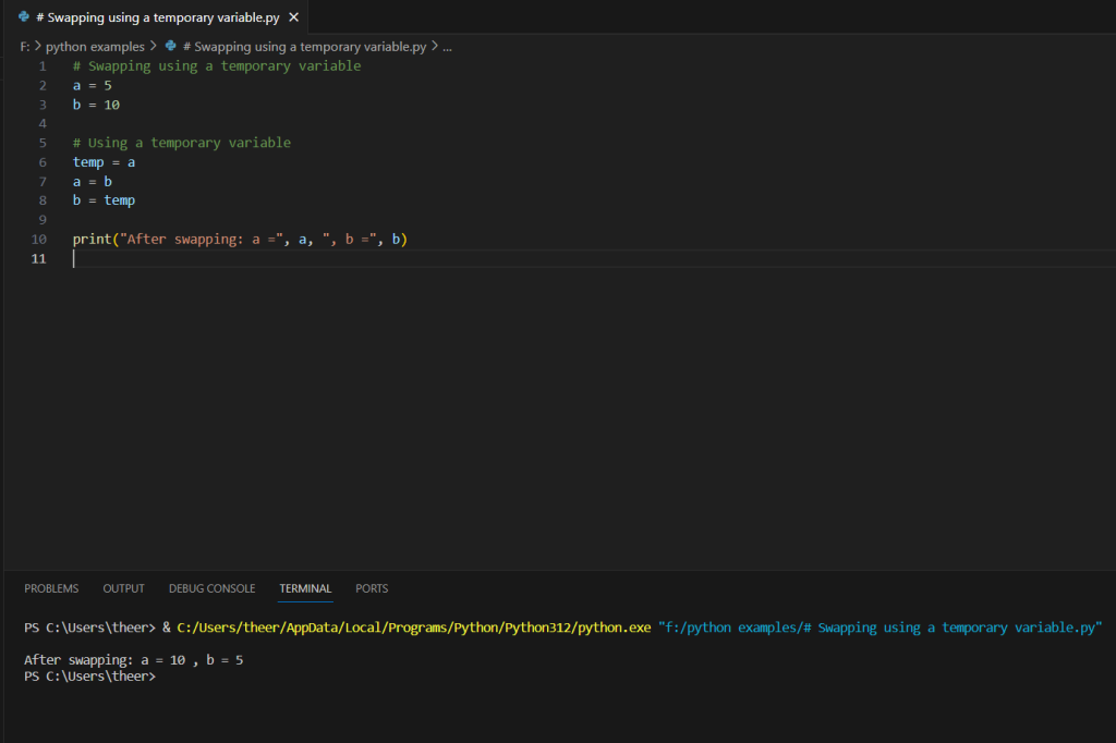 aandbhave effectively swapped.print("After swapping: a =", a, ", b =", b)Running this code will display: “After swapping: a = 10 , b = 5”
