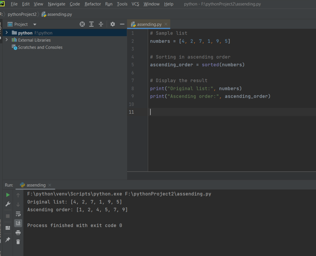 print("Ascending order:", numbers)Example output:cssCopy codeAscending order: [1, 2, 4, 5, 7, 9]